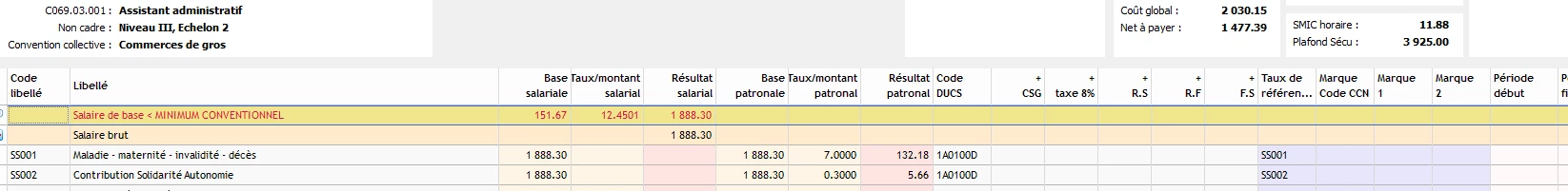Le salarié est embauché, pour la première fois, au niveau III échelon I, avec un salaire brut de 1 888,30 € pour 151,67 heures par mois, soit un taux horaire brut de 12,4501 €. Normalement, le salaire minimum conventionnel est de 12,4184 €, soit 1 883,50 € brut/mois. Nous sommes donc bien au-dessus du minimum conventionnel, et pourtant la ligne apparaît en rouge sur le bulletin de salaire.