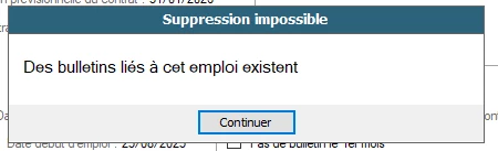 Je n’arrive pas à supprimer l’emploi 2, il me dit que des bulletins ont déjà été effectué et je ne peux supprimer l’emploi. Et je n’ai pas de doublon au niveau des bulletins..