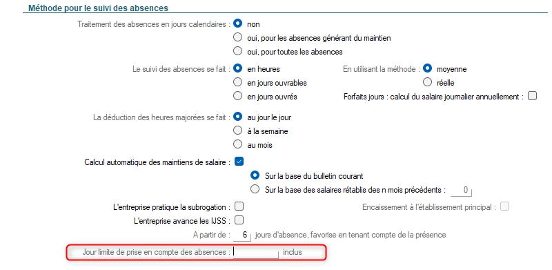 Vérifiez dans la fiche société, dans la limite du jour de prise en compte des absences, vous devez avoir la valeur 30 :