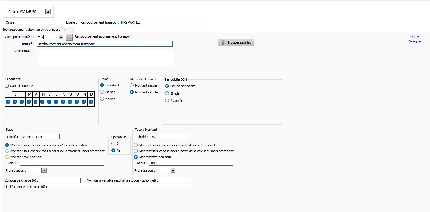 Je souhaiterai créer un profil Variable à affecter pour certains de mes salariés (comme PCCN) pour le remboursement de transport des temps partiels exerçant à la semaine moins de 17.5h en respectant cette base de calcul :