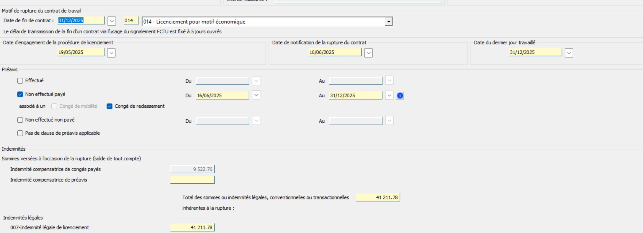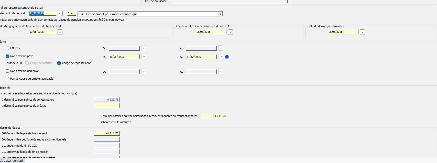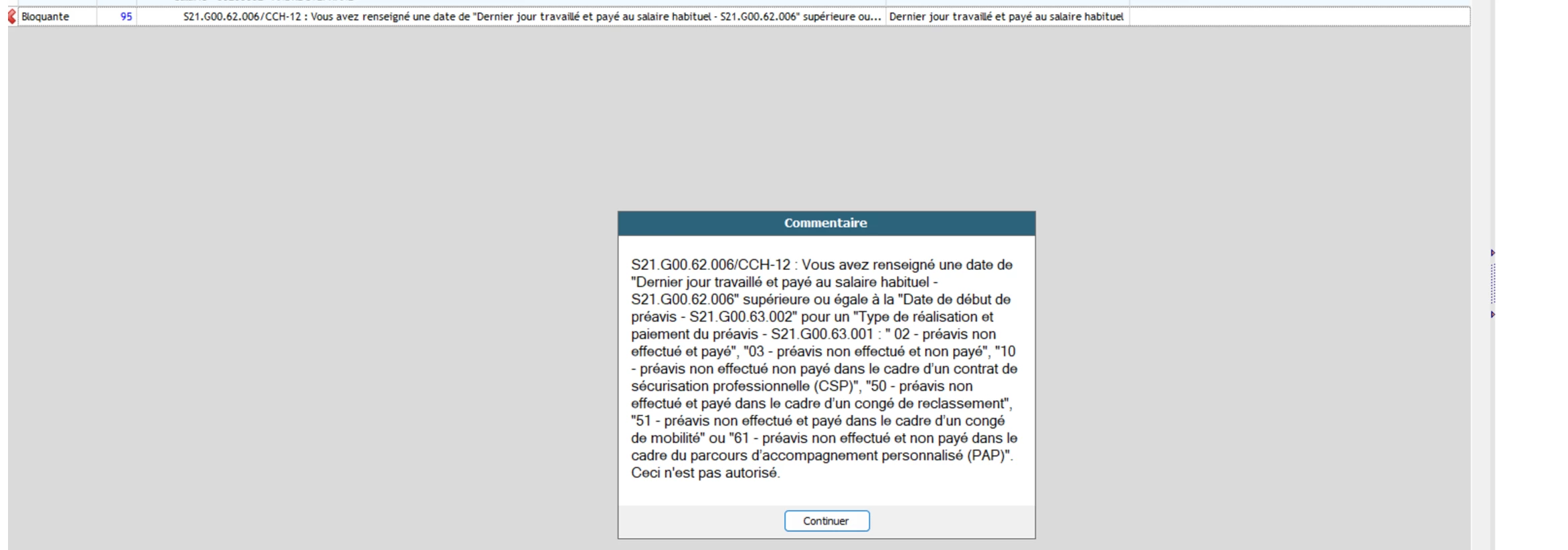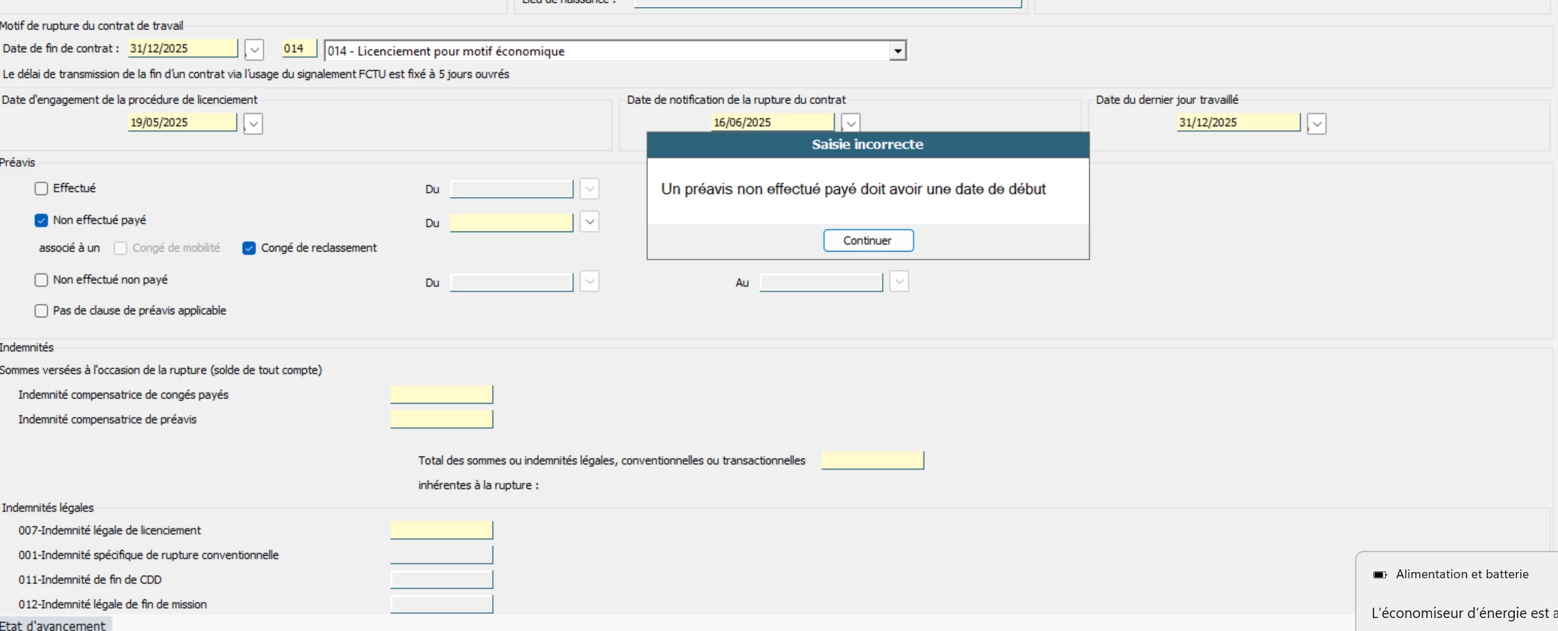 J’ai depuis ce matin une anomalie bloquante sur une AED que je n’arrive pas à résoudre, je suis sur un licenciement éco avec congé de reclassement donc un préavis non effectué payé, seulement j’ai tous essayé au niveau des dates et rien de fonctionne. Je désespère et fait donc appel à vous.