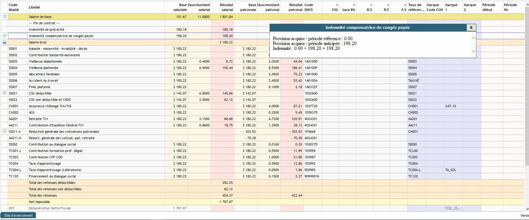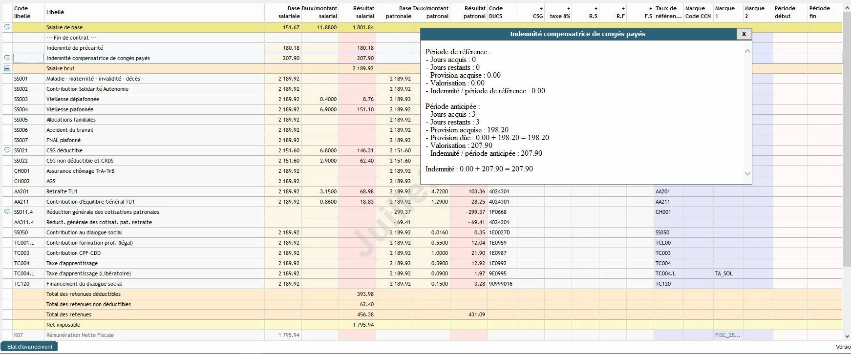 Le bulletin de salaire est le même au niveau du salaire de base et de l’indemnité de précarité qu’en juillet 2025. Sauf qu’au lieu de faire aussi le paiement au maintien de l’indemnité compensatrice CP, il fait le paiement au 10ème.