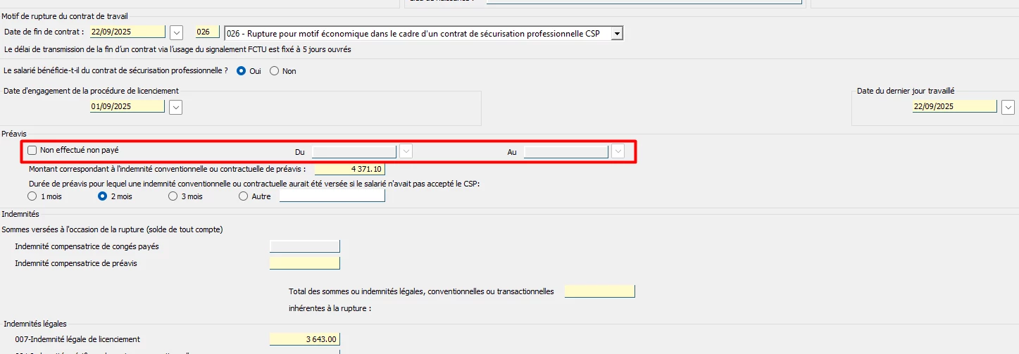 Lorsque je renseigne sa sortie sur Silae, je renseigne le montant équivalent à l’indemnité ainsi que les 3 mois de préavis. En voici l’exemple :