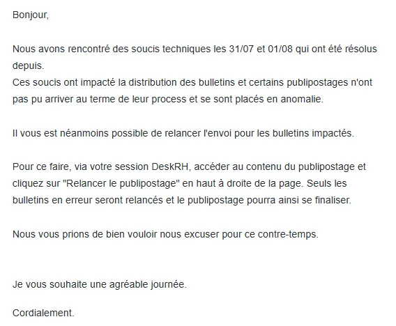@Anthony Petit : j’ai une demande au support SILAE mais pas de retour => avez-vous plus d’informations pour débloquer rapidement la situation car les clients attendent leur bulletin en cette fin de mois et période estivale ?