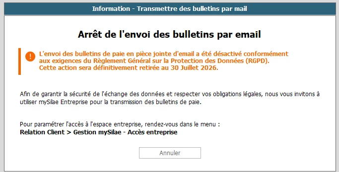 mais lorsque je clique sur Envoyer par mail le bulletin, j’ai une fenêtre d’erreur qui s’affiche, alors que les droits à My Silae du client sont bien ouverts dans le module...