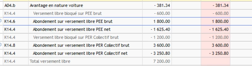 Je suis passé sur le module épargne pour le versement PEE er PERCO, le montant de la CSG/CRDS est juste sur le bulletin, mais le tonal versement libre est de 7200 alors qu’il devrait être de 5400 car 1800 PEE et 3600 PERCO. Nous avons regardé sur d’autres dossiers nous avons le même problème, je voudrais savoir si c’est une anomalie ou un problème de paramétrage svp.