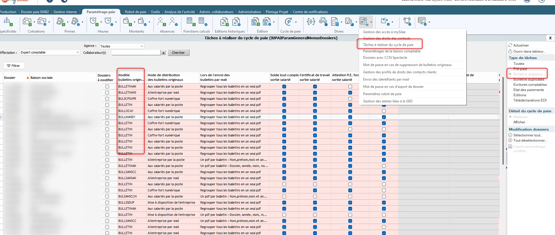 Il conviendra de passer dossier par dossier, mais cela peut être fait en masse via l’onglet Paramétrage Paie / Taches à réaliser du cycle de paie :