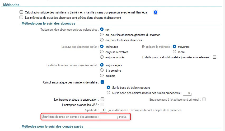 Dans la fiche société, vérifiez la date limite de prise en compte des absences :
