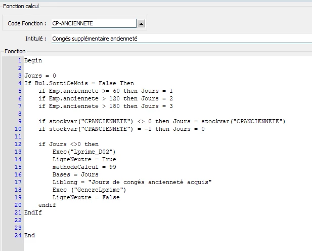 J ‘ai créé une fonction calcul pour l’acquisition de CP supp suivant l ‘ancienneté, cela fonctionne mais va dans le compteur de CP de base. mais ma cliente voudrait dans un compteur appart comme ci dessous.