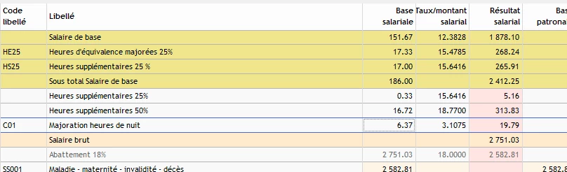 Dans le transport , êtes vous d’accord sur le fait que la majoration de nuit vienne se rajouter dans la base soumise à cotisation : 151.67*11.88+17.33*11.88+17*11.88*1.25+0.33*11.88*1.25+16.72*11.88*1.5=2563.02, pour trouver la base soumise de 2582.31 je dois rajouter les 19.79 de majorations de nuit.