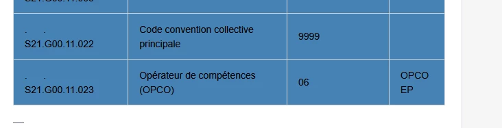 une capture d’écran de votre DSN où la ligne S21.G00.11.023,02, où le 02 renseigne l’Afdas en OPCO.
