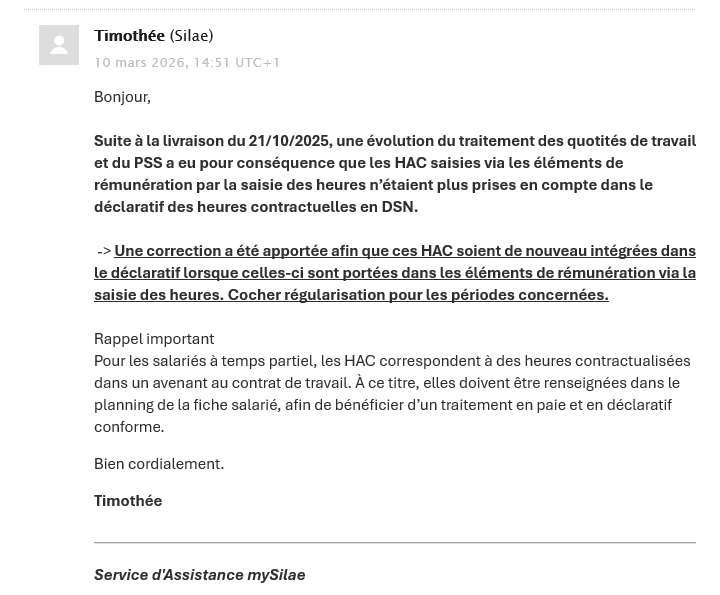 Correction du traitement des Heures d'avenant Contrat (HAC) : Suite à la livraison du 21/10/2025, une évolution du traitement des quotités de travail et du PSS a eu pour conséquence que les HAC saisies via les éléments de rémunération par la saisie des heures n’étaient plus prises en compte dans le déclaratif des heures contractuelles en DSN.