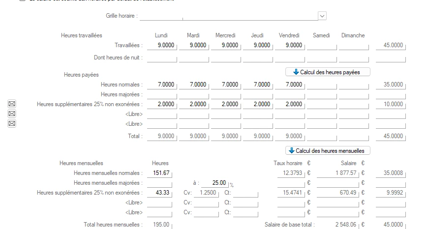 Pour les heures supplémentaire, j’ai trouvé le moyen d’ajouter une colonne dans les heures “Heures supplémentaires 50% non exonérées” (code HS50-HT) mais je suis embêté pour les heures sups “structurelles” qui font partie du salaire de base soit 21,67 heures dans ce cas précis. Je ne sais pas comment les compter comme exonérées aussi.