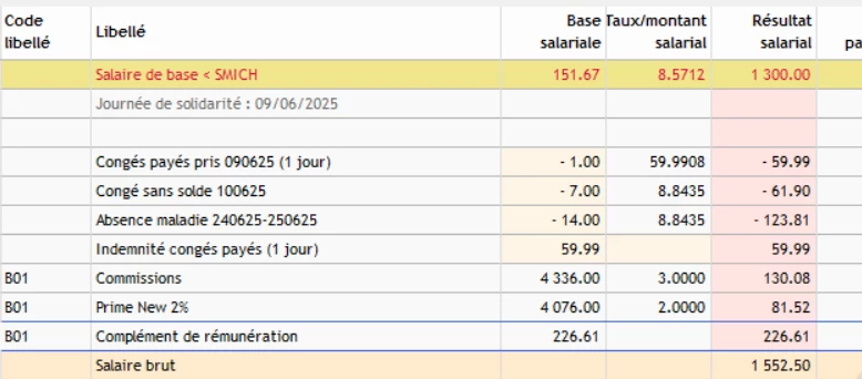 J’ai des salariés qui ont un contrat sur un salaire de base inférieure au SMIC , ils ont des objectifs à atteindre et si celui-ci n’est pas atteint ils ont un complément pour atteindre le SMIC. Ma question concerne les absences ou par exemple sur un congé sans solde le taux est de 8,8435 mais je voudrais que ce vaux soit au SMIN comment faire ? Quand je double clique sur le taux je ne peux pas modifier.