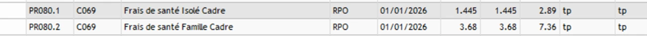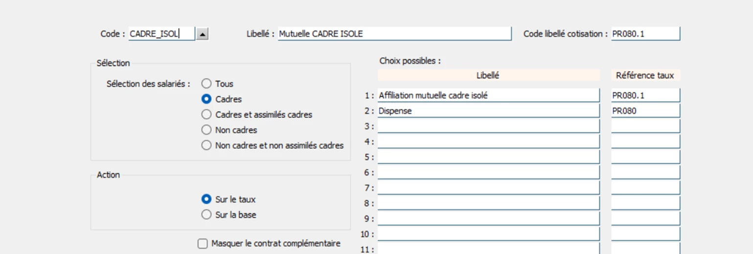 Pour le cadre isolé, j’ai utilisé la rubrique PR080, mais je n’arrive pas à trouver oucréer une seconde rubrique mutuelle cadre basée sur le PMSS pour le cadre famille.