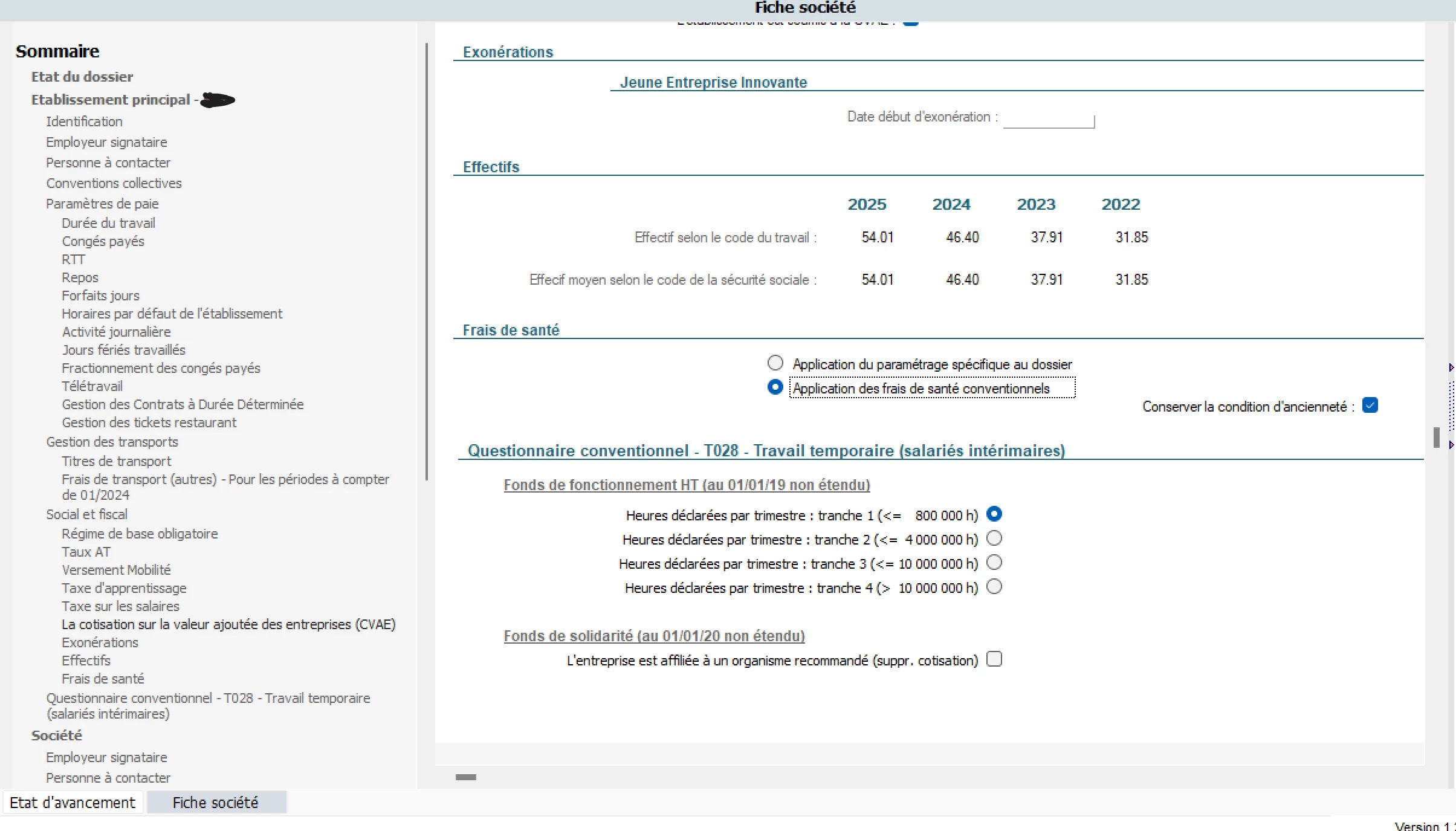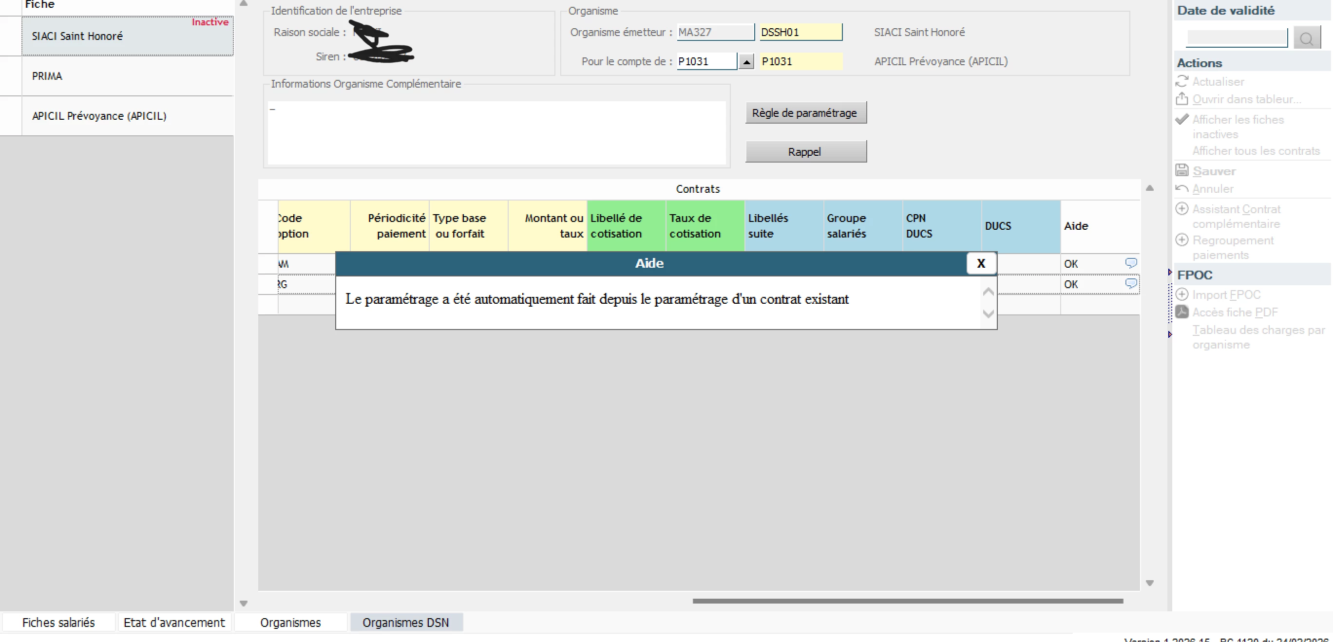 La mutuelle se déclenche sous condition d’ancienneté de 414h de l’intérimaire dans la société ou dans une autre société d’intérim. C’est un régime conventionnel. Dans l’onglet société j’ai bien mis régime conventionnel. L’organisme est paramétré. J’ai mis la fiche de paramétrage qui était ok mais qui est passée “inactive” avec le message sur l’impression écran.