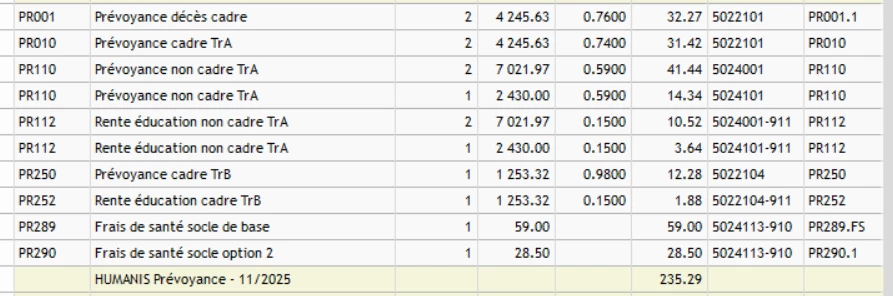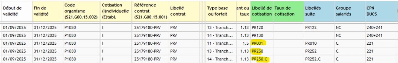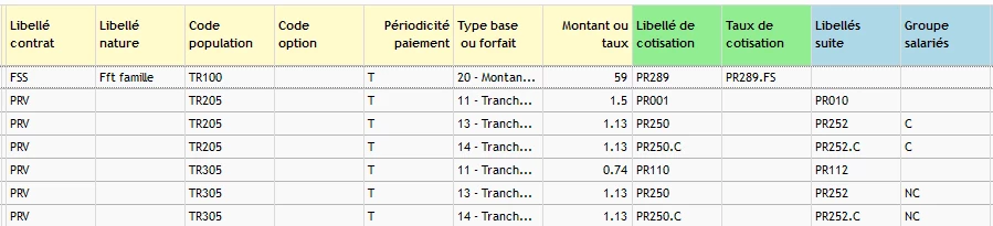 tous les libellés inscrits à gauche du tableau des charges sont les Libellés de cotisations, et tout ce qui est à droite, ce sont les taux de cotisation. Lorsque le libellé et le taux sont le même, c’est égal, vous pouvez remplir une des deux colonnes. En revanche, quand le taux diffère (exemple : le libellé est PR001 MAIS le taux est PR001.1), il vaut mieux remplir la colonne taux de cotisation avec le taux. Dans la colonne libellé suite, en revanche, il faut marquer les libellés supplémentaires (donc ici la PR010)