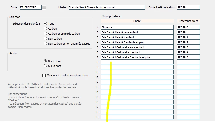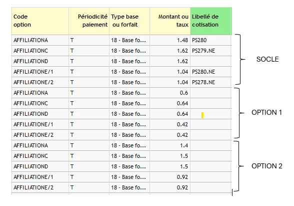 Par exemple pour un salarié s’affiliant à la mutuelle avec son conjoint et 1 enfant en option 1, la caisse attends 6 lignes ==> taux 1.48 + 1.62 + 1.04 pour le socle et taux 06 + 0.64 + 0.42 pour l’option 1.