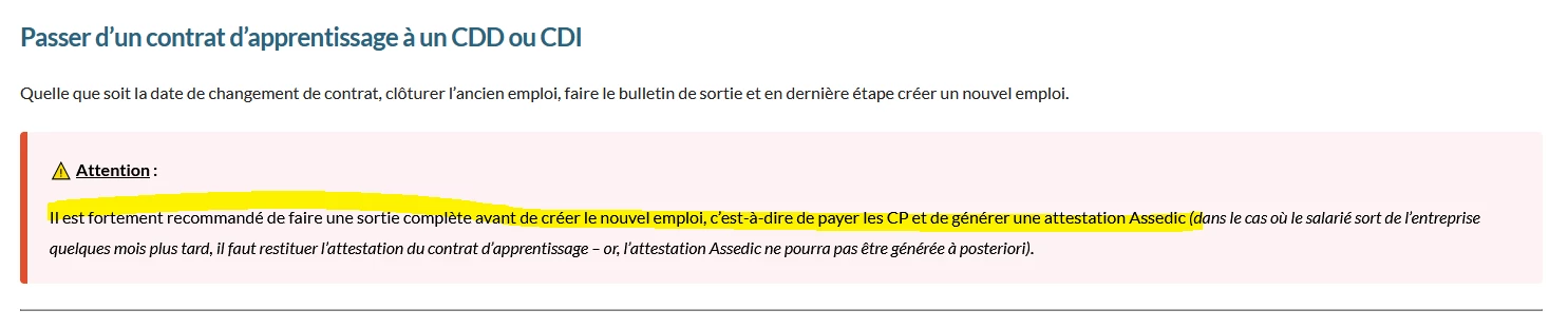 Nous avons un client qui a beaucoup d’apprentis, début septembre ils basculents en CDI avec reprise ancienneté et CP mais le client veut une attestation employeur France travail pour la fin du contrat d’apprentissage… Impossible de mettre 902 en motif de sortie et de générer attestation FT!