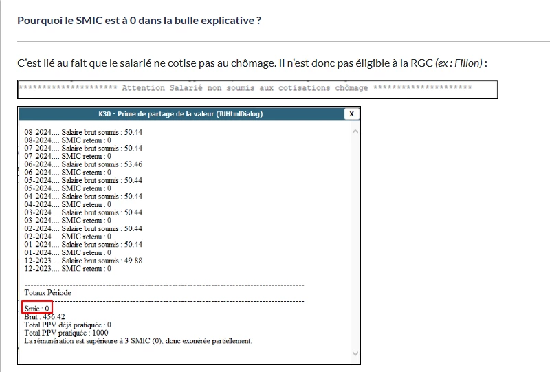 Pour la PPV, elle bénéficie de l’exonération de charges sociales mais pas fiscale, car le SMIC retenu est 0 (SMIC RGCP → Exclusion de ma salariée)