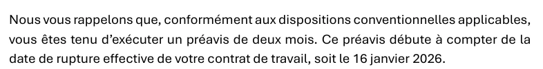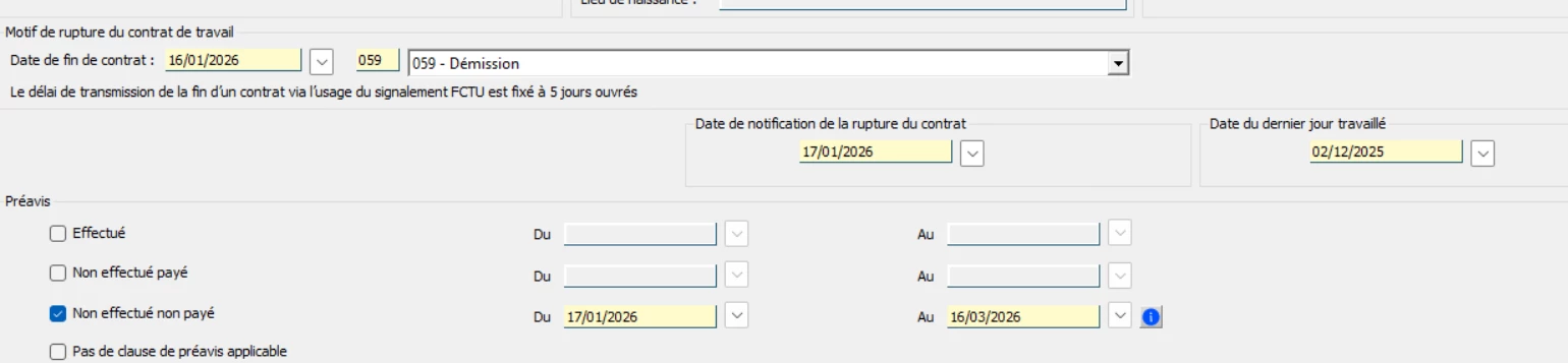J’ai un salarié qui s’est absenté depuis le 03/12/25, deux courriers de mises en demeure ont été envoyés les 11/12 et 30/12. Le 30/12, un courrier a été envoyé pour fixer un entretien au 16/01/26, le courrier a été reçu le 02/01/26. Le salarié ne s’est pas présenté à l’entretien, la date de rupture a donc été fixé au 16/01/26. Un préavis de deux mois s’applique, donc bulletin de fin à éditer au 16/03/26.