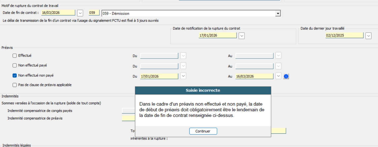 Sauf que lorsque je veux faire mon bulletin de mars, dans l’assistant de sortie il ne m’est pas possible d’indiquer cela car les dates de préavis ne vont pas car postérieures à la date de fin :