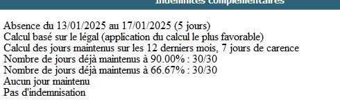 Sur un dossier relevant de la CCN Propreté et services associés, nous avons constaté une anomalie dans le calcul du maintien de salaire pour une salariée en arrêt maladie du 13 au 17 janvier 2025. Elle est bien employée et devrait bénéficier d’un maintien de salaire après 3 jours de carence.