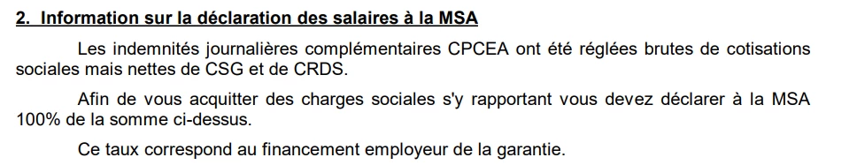 J’ai reçu un récapitulatif des IJ CPCEA mensualisation versé à la salarié de la part de la MSA. Sur ce document il m’indique que les IJ complémentaires CPCEA ont été réglées brut de cotisations mais nettes de CSG. Je dois donc déclarer les charges sociales à la MSA sur 100% de la somme. le taux dois correspondre au financement employeur de la garantie.