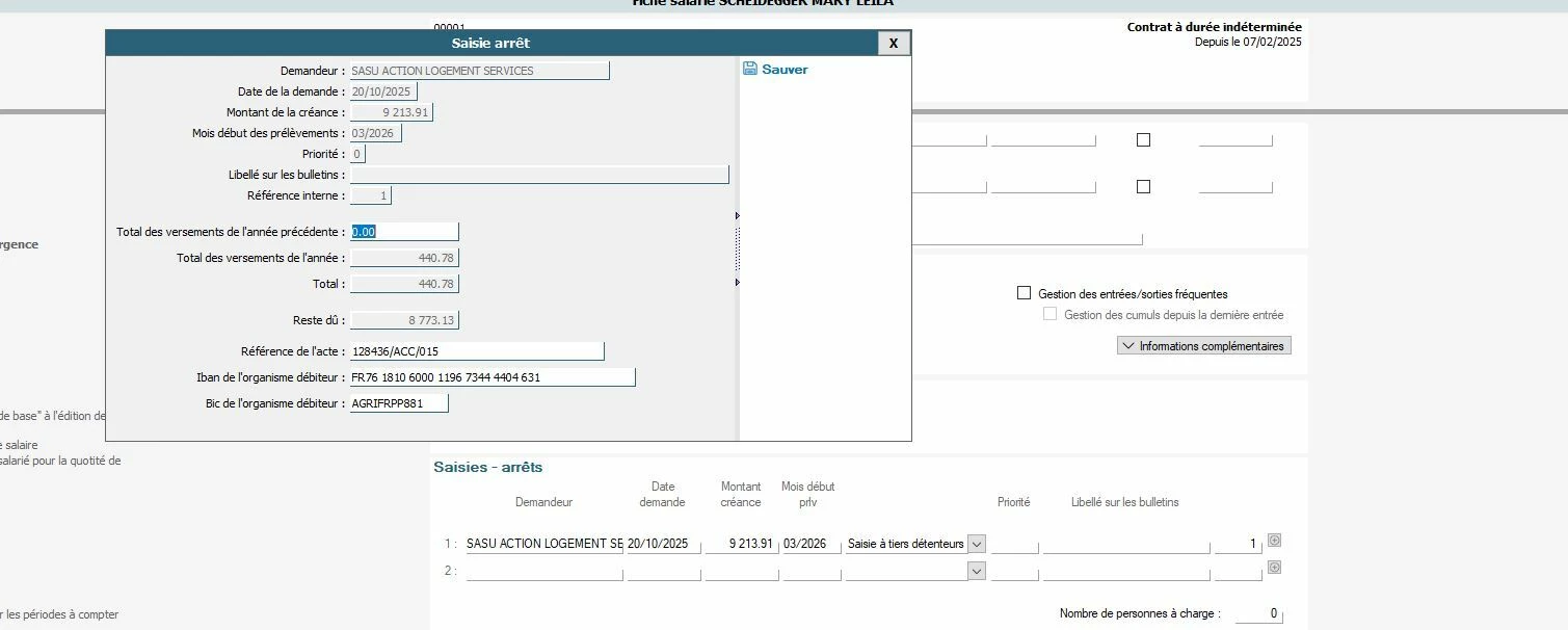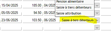 si l’on renseigne une saisie sur salaire de 180 € le logiciel nous indique la saisie de 180 € et rajoute une deuxième ligne de la différence de la quotité saisissable et les 180 €