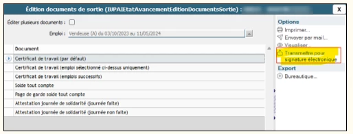 La signature électronique est activée toutefois les certificats de travail et reçu pour solde de tout compte ne sont pas déposés dans l’onglet signatures.