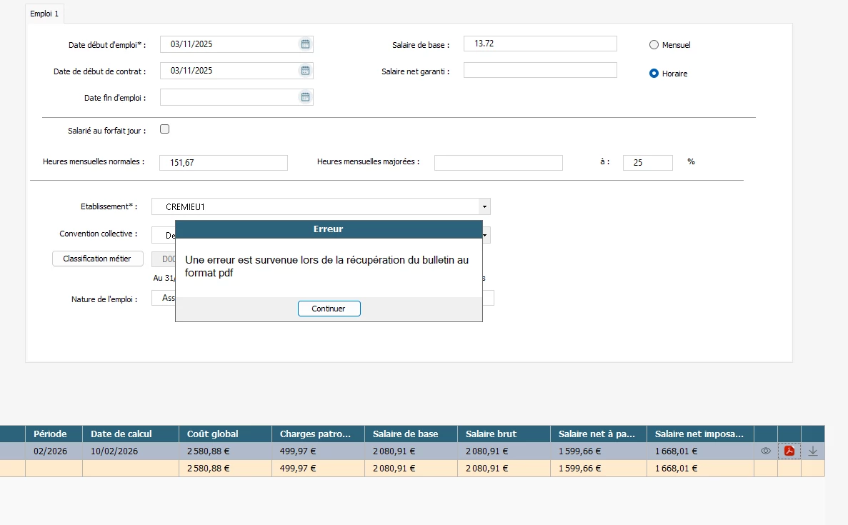Depuis hier nous essayons d’utiliser le module de simulation de bulletin de salaire mais un message d’erreur apparait à chaque fois et nous empêche de travail.