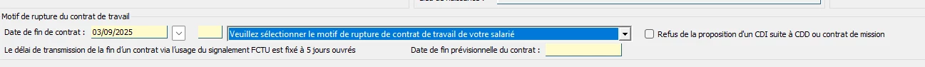 Un salarié à démissionné au 03/09/2025, je souhaite effectuer sa sortie mais lorsque je clique sur “sortie du salarié”, ça ne se pré-rempli pas et je n’ai pas le “motif démission”.