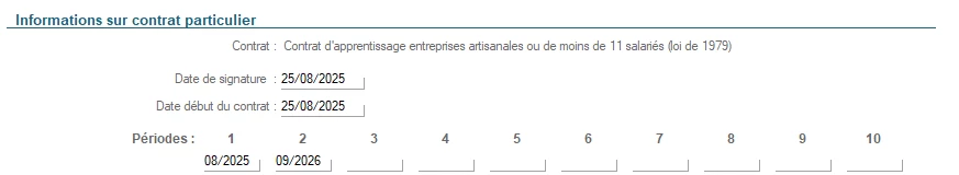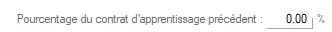 - Pourcentage du contrat d’apprentissage précédent : Le logiciel reprend automatiquement le pourcentage le plus élevé entre le taux saisi dans cet encadré et le taux calculé pour le contrat actuel (calcul logiciel).