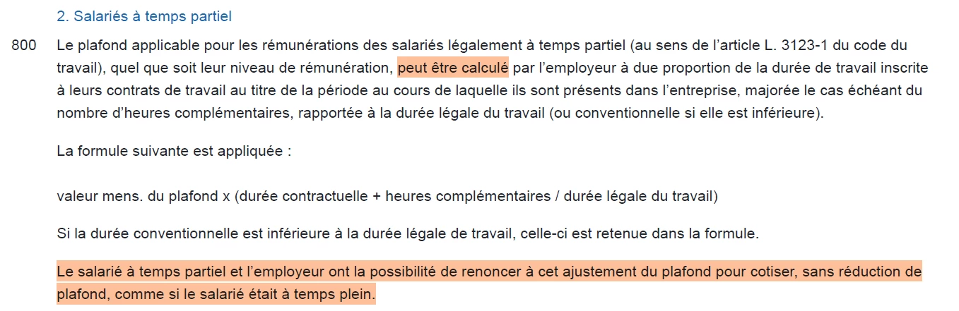 Le BOSS prévoit que: “Le salarié à temps partiel et l’employeur ont la possibilité de renoncer à cet ajustement du plafond pour cotiser, sans réduction de plafond, comme si le salarié était à temps plein.”