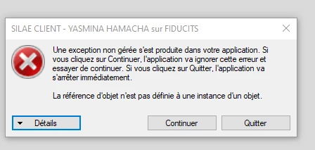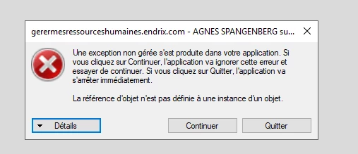 Le message suivant apparaît : “Une exception non gérée s’est produite dans votre application”.