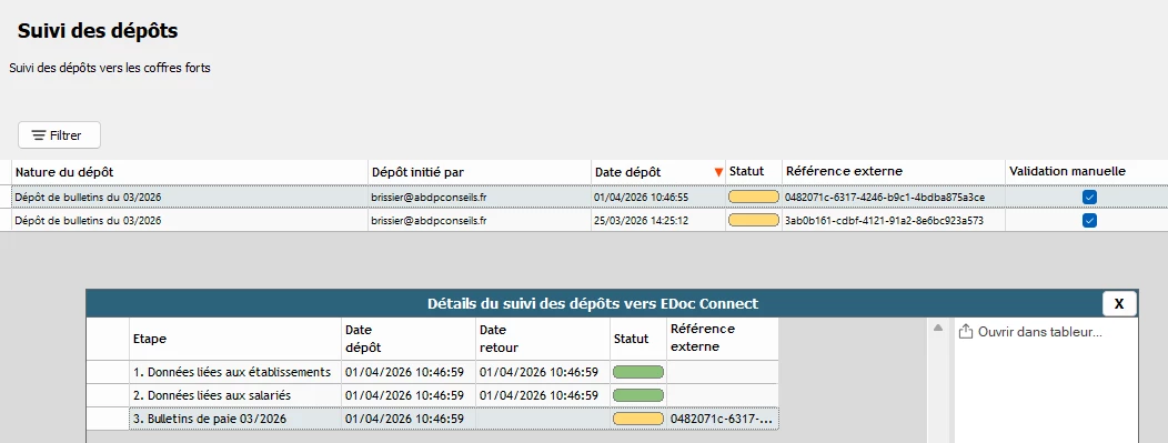 Dans le détail du suivi des dépôts vers edoc connect, la bulle est jaune.